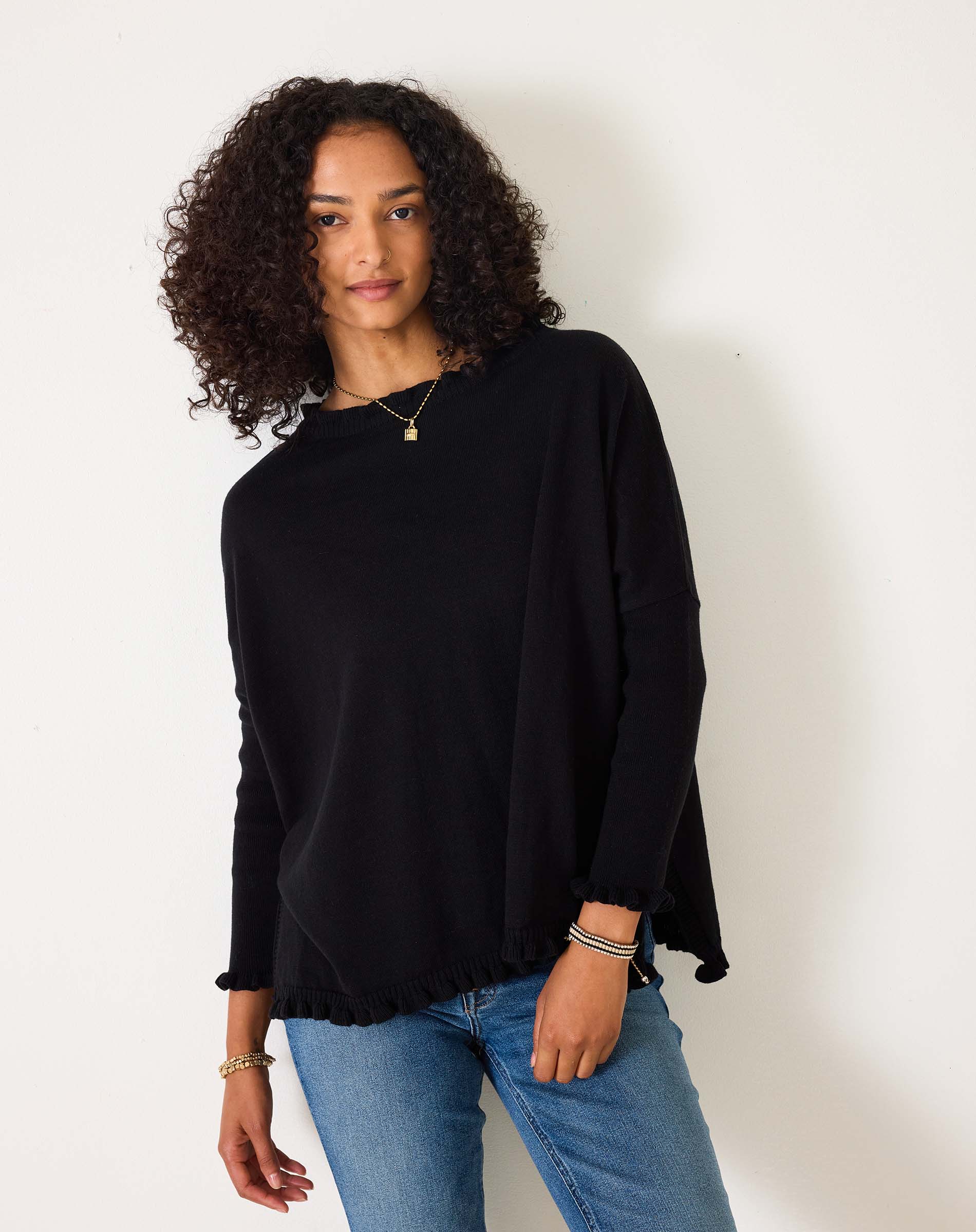 The newest addition to our MVP Catalina collection—the Catalina Cotton Sweater—available in a classic crewneck, feminine polo and now a ruffle. Made in Morocco with the same chic drop shoulder and split side you love, now in super-soft cotton-rich fabric. The polo is an elevated silhouette with a scalloped contrast collar and delicate Swiss dot details for a subtle, romantic touch. The ruffle brings a playful twist, with a feminine flounce neck, hem and cuff. Wear the lightweight cotton silhouettes every day, year-round. Named after Catalina Island for its stunning simplicity and made to last for years to come, welcome to the family Cotton!