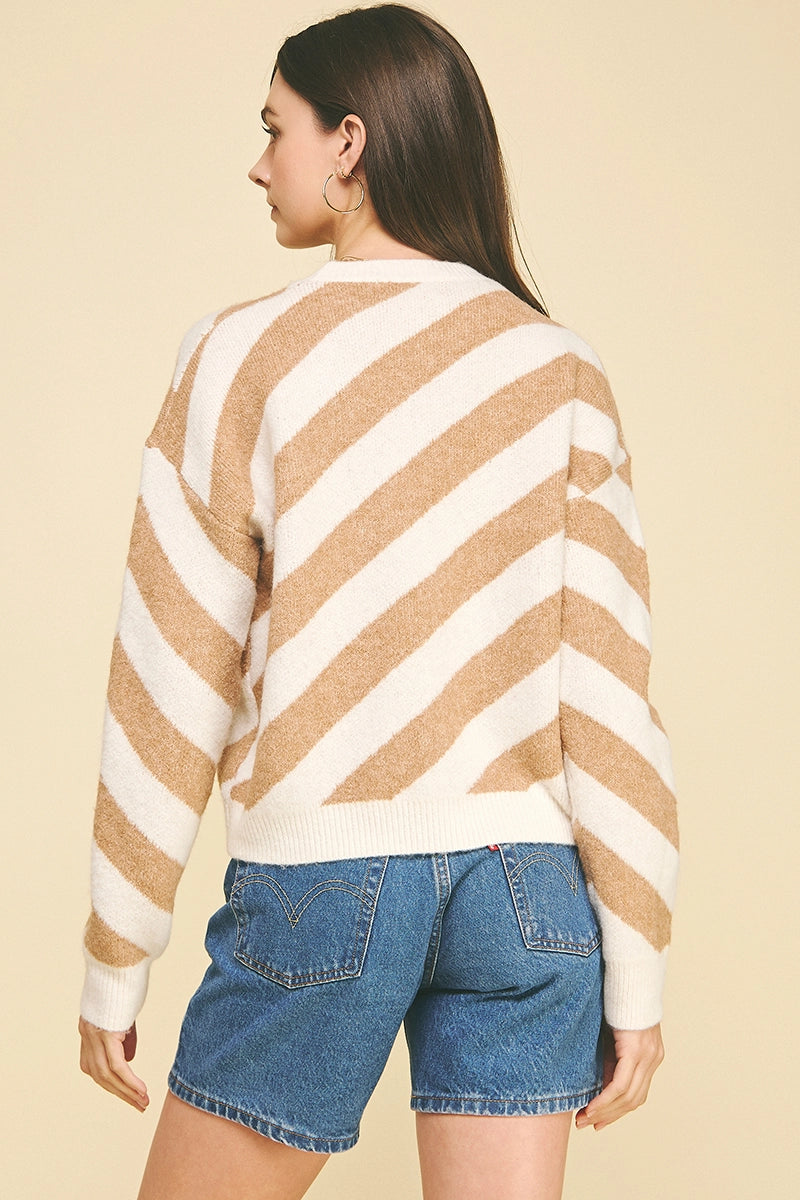 Diagonal Stripe Knit Sweater - Cream/Taupe