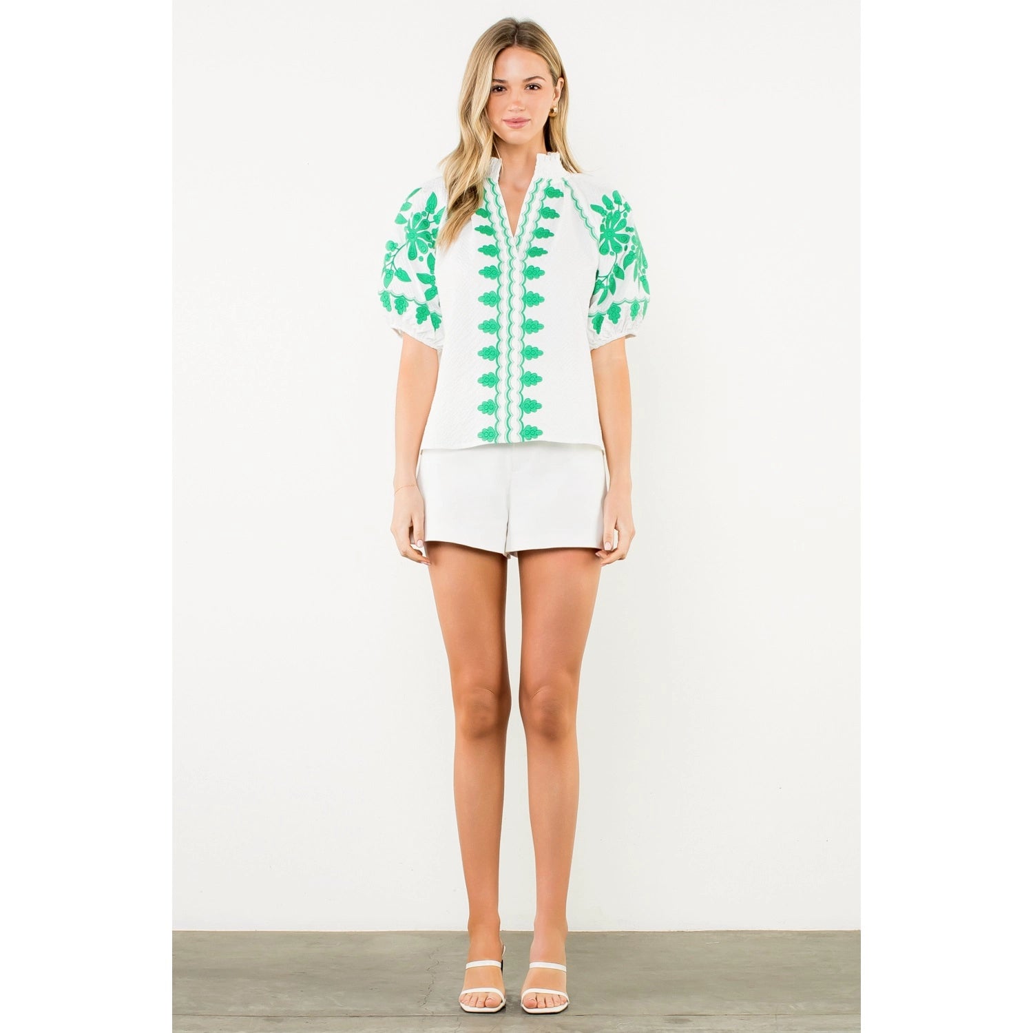Embroidered Smocked Neck Puff Top - White