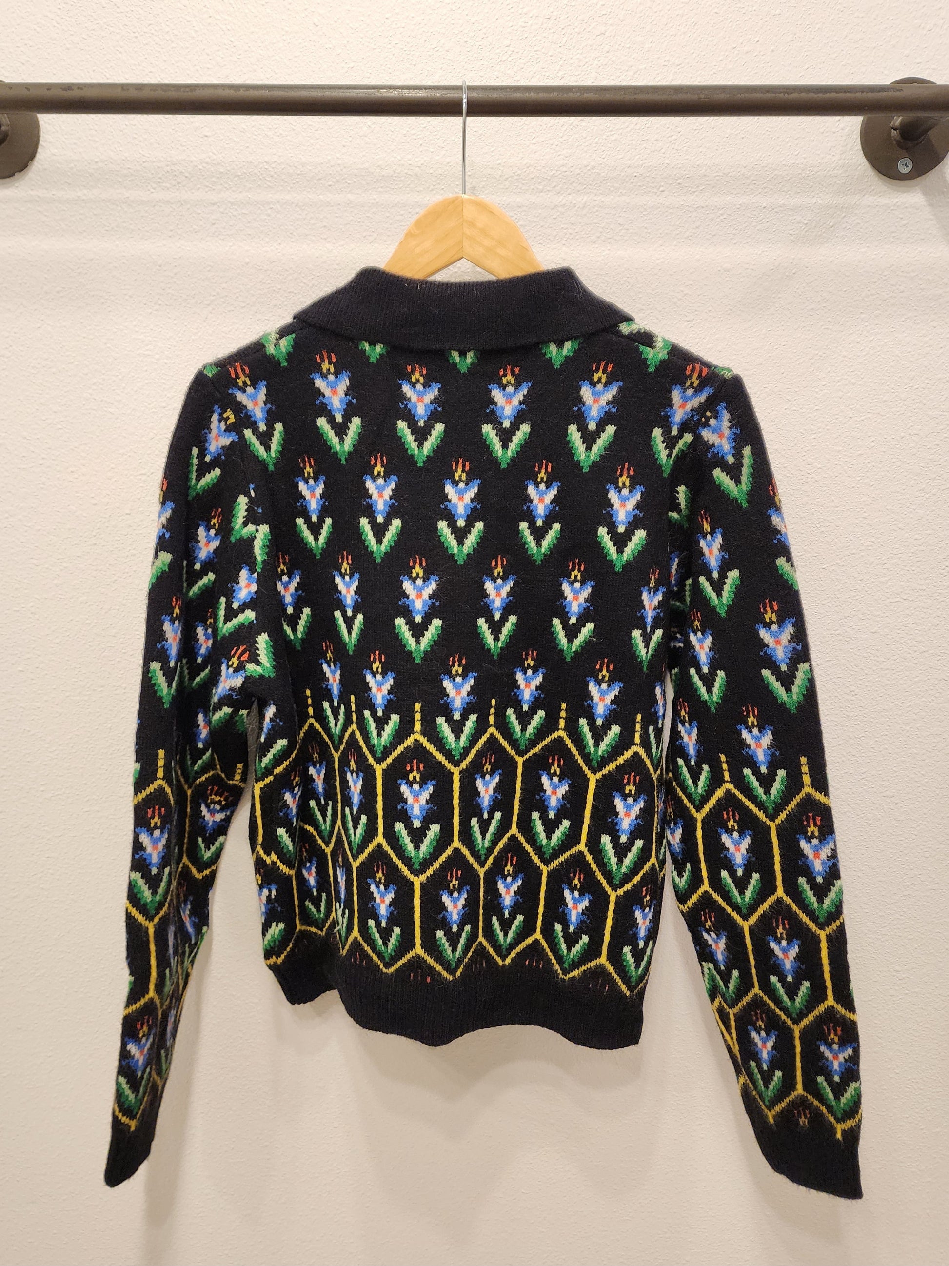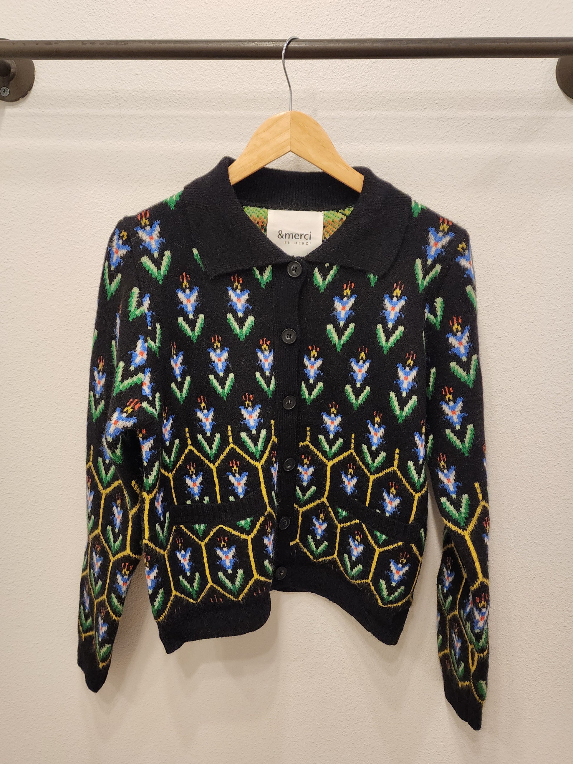 Floral Knit Collared Sweater Cardigan - Black Multi