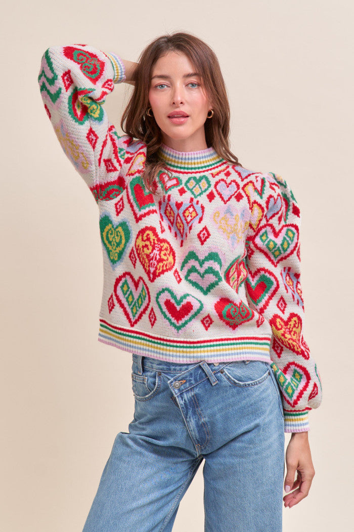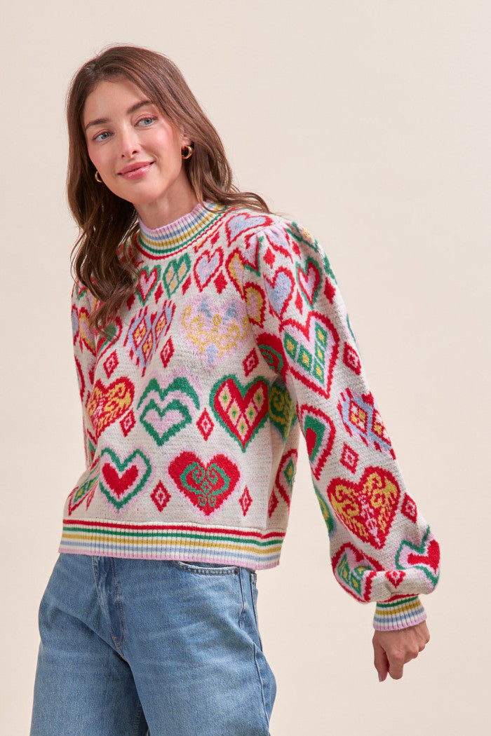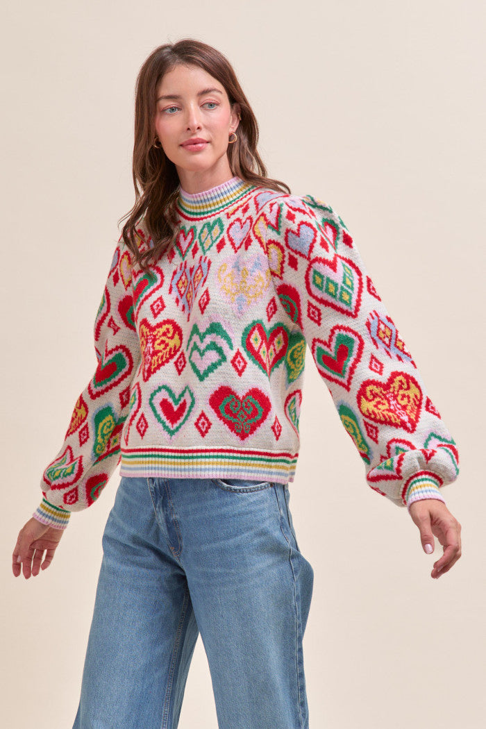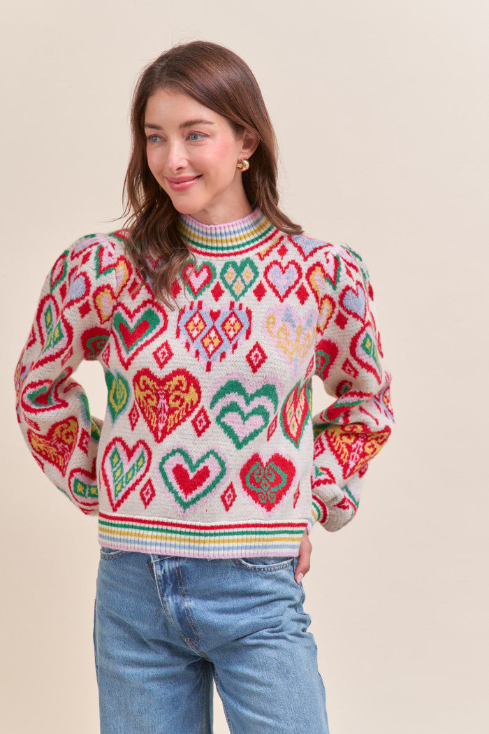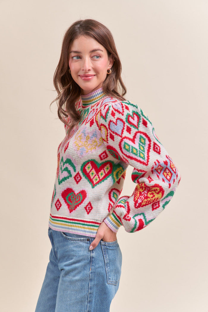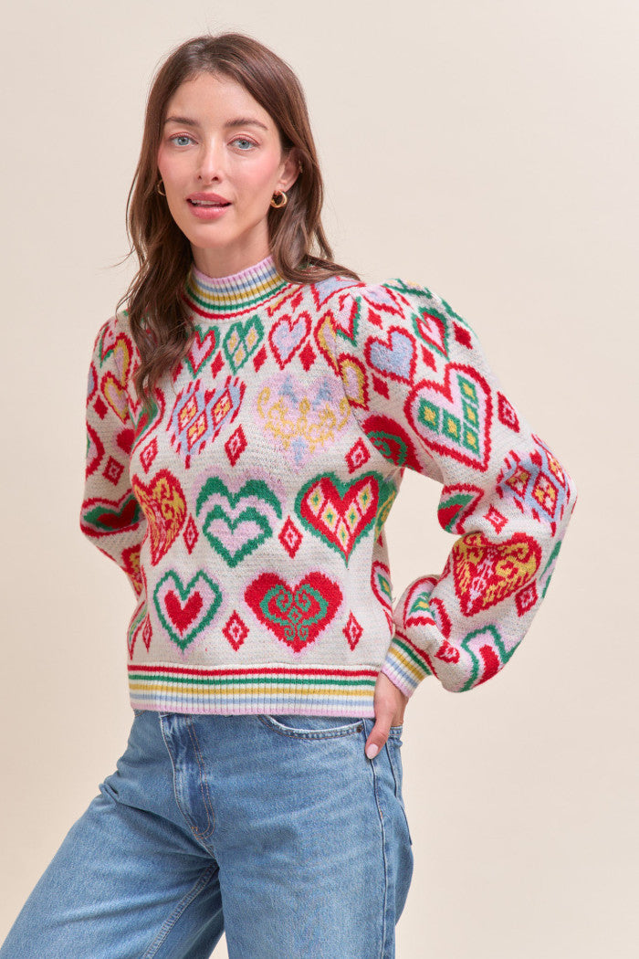 This heart pattern pullover sweater will keep you looking trendy and cozy all season long! Warm and cozy knit creates this gorgeous sweater and mock neckline, long balloon sleeves, and relaxed bodice that ends at the waist. Colorful striped knit accents the ribbed neckline, cuffs, and hem.