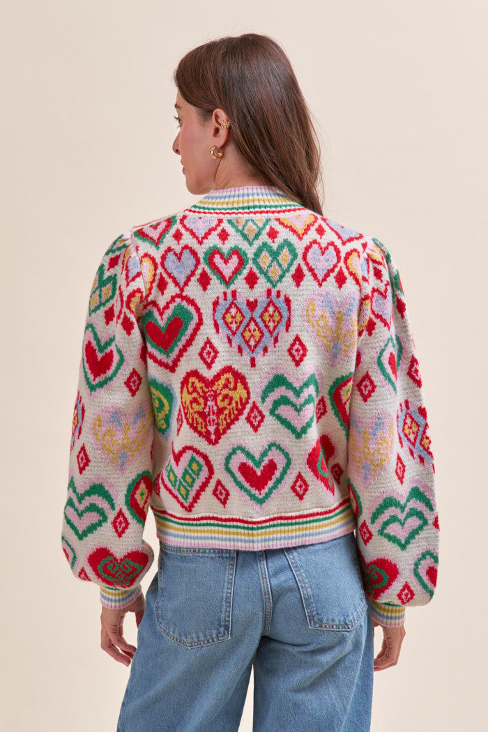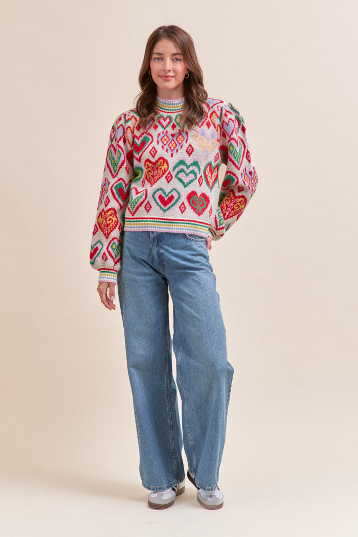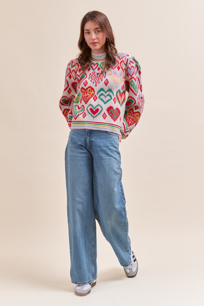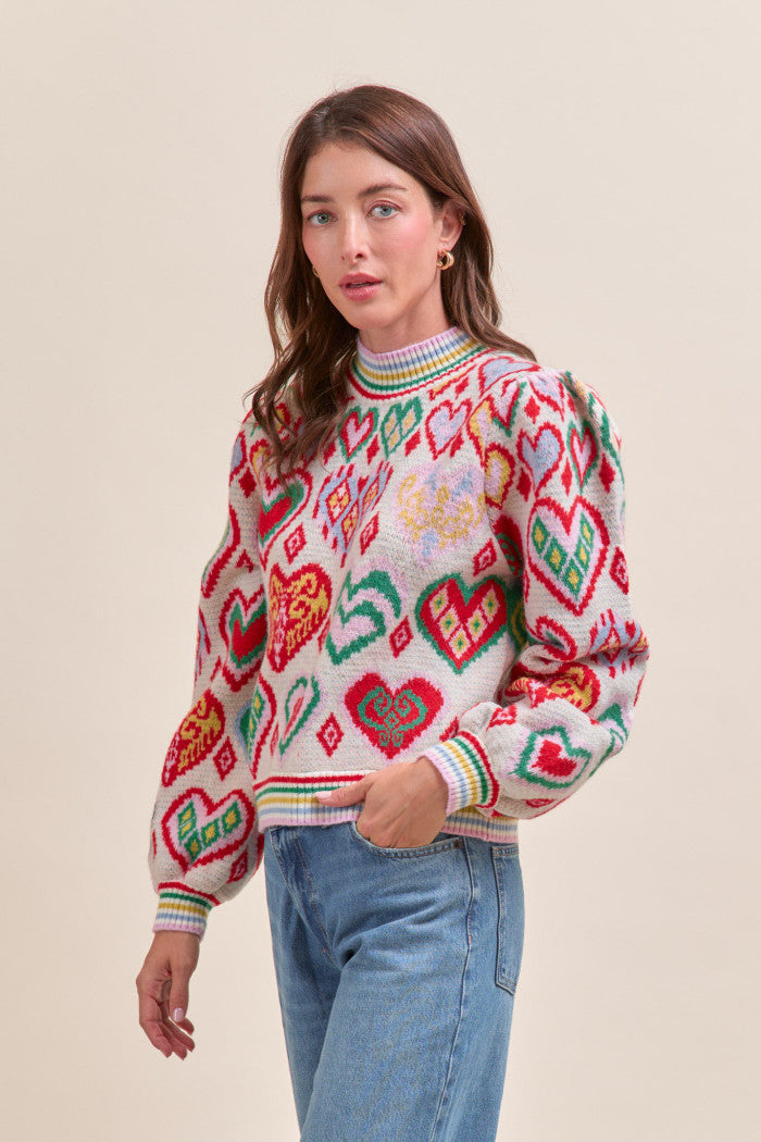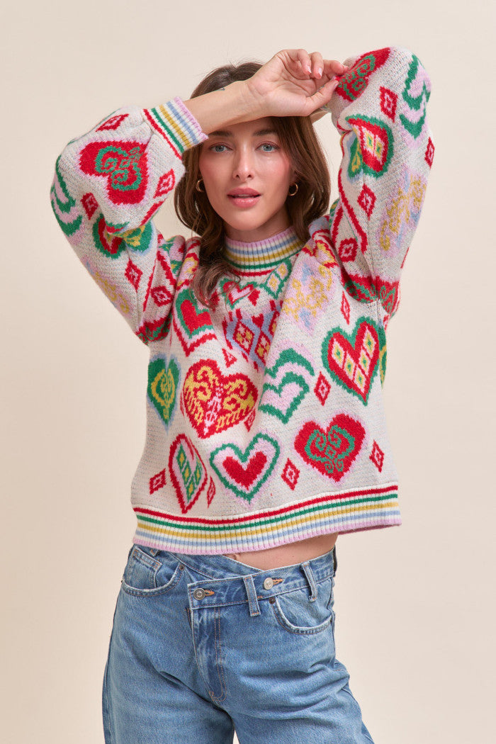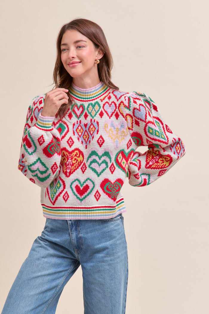 This heart pattern pullover sweater will keep you looking trendy and cozy all season long! Warm and cozy knit creates this gorgeous sweater and mock neckline, long balloon sleeves, and relaxed bodice that ends at the waist. Colorful striped knit accents the ribbed neckline, cuffs, and hem.