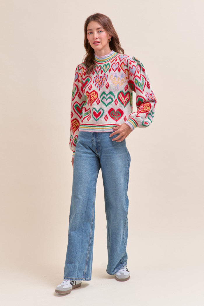 Heart Pattern Pullover Sweater - Ivory Red Multi