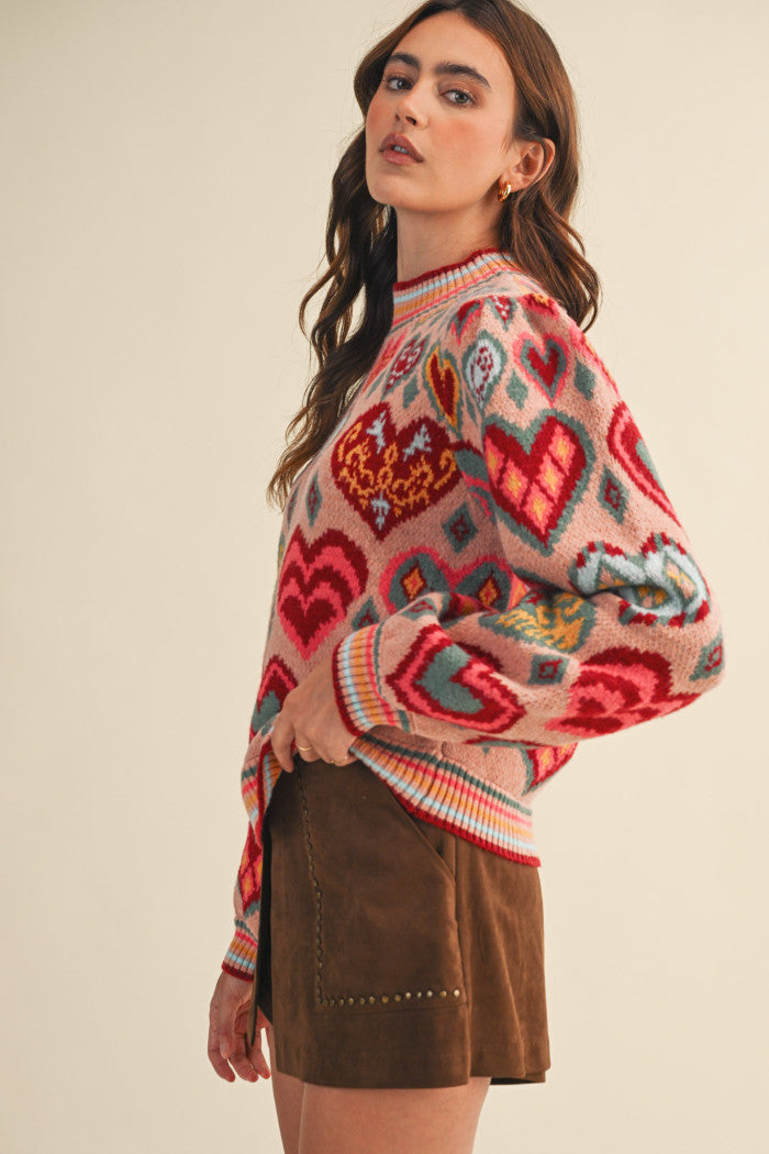 This heart pattern pullover sweater will keep you looking trendy and cozy all season long! Warm and cozy knit creates this gorgeous sweater and mock neckline, long balloon sleeves, and relaxed bodice that ends at the waist. Colorful striped knit accents the ribbed neckline, cuffs, and hem.