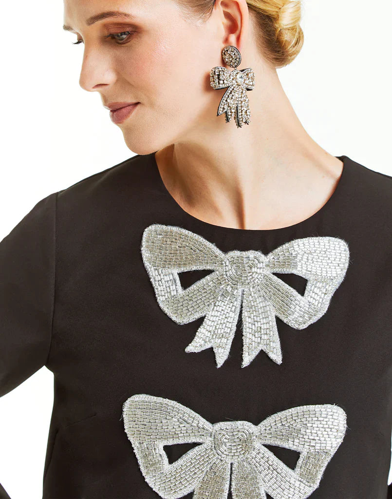 - Crew neckline shift mini bow dress crafted in a stretch crepe