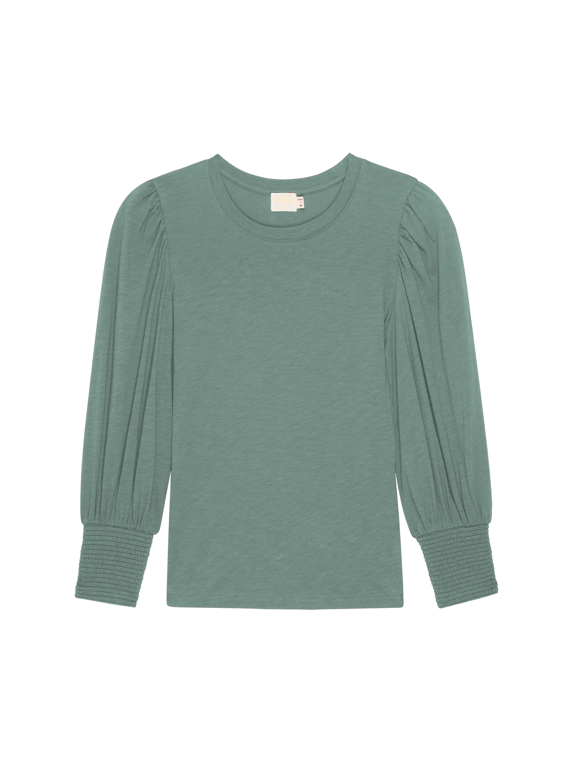 The ease of a comfortable, cotton tee meets the look of a fancy blouse. An exaggerated shoulder, volume in the 3/4 length sleeve, and smocking around the cuff create a delightfully feminine look. It's our best seller for a reason. This one comes in Sagebrush.