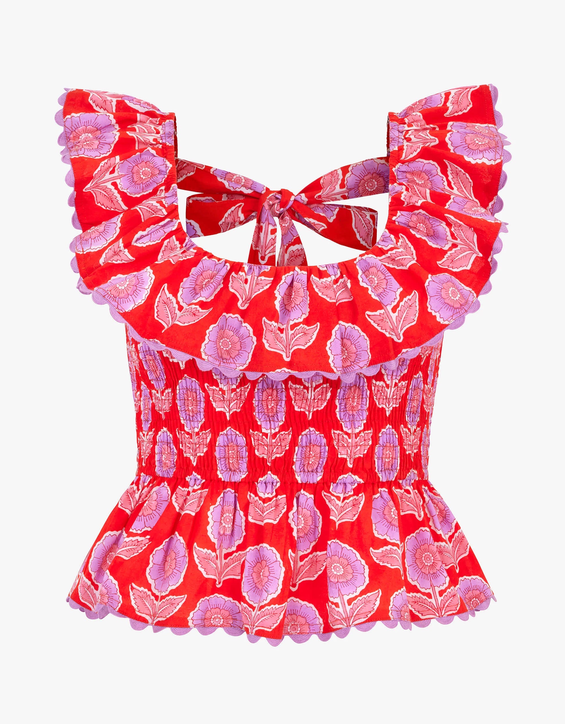 Screen-printed by hand in pretty shades of lilac, pink and red, our Perfume Dahlia Susie top is a versatile piece you’ll be wearing again and again. Finished with a statement, ruffled scoop neckline and pretty bow back, the Susie top features rows of comfortable smocking and a flattering peplum silhouette. Pair with the matching Rah Rah skirt for special occasions, or style with linen shorts for a more casual trip. Finished with a playful, lilac ric-rac trim.