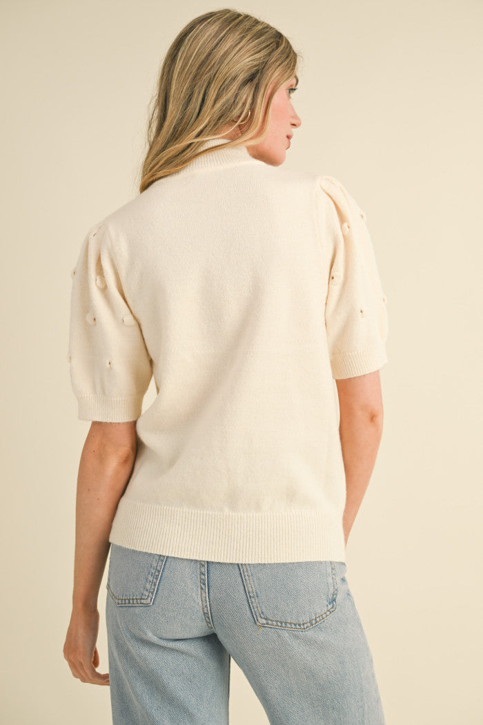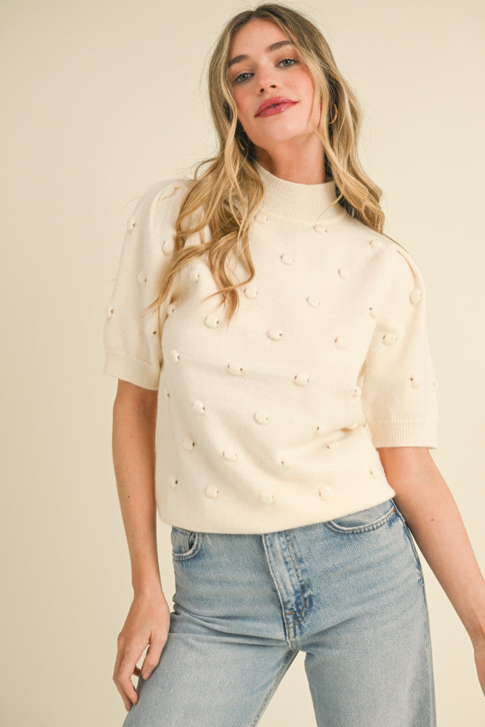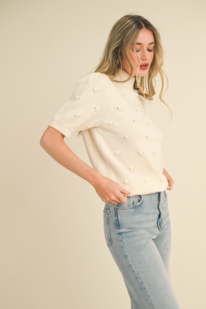 Upgraded style is easy to achieve when you have this popcorn knit short sleeve sweater top! Soft sweater knit, in 3D popcorn knit, shapes this essential sweater top that has a ribbed mock neckline framed by short puff sleeves. Contrasting ribbed knit accents the neckline, cuffs, and hem.