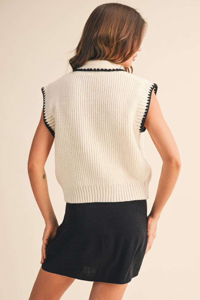 Endlessly cute outfits are in rotation with this tie neck sweater vest! Cozy sweater knit shapes a tying neckline with a button down placket and sleeveless relaxed bodice. Blanket triangle stitch in a contrast knit color adds chic accents to the tying neckline, button placket, and armholes. Pair this versatile sweater vest with your favorite bottoms for an upgraded look!