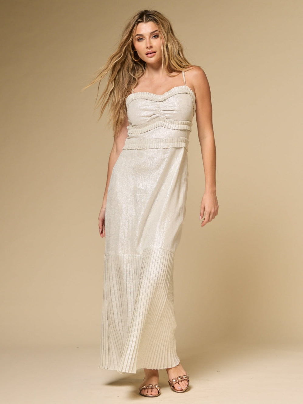 The Valia Dress is a shimmering linen-lurex maxi dress in cream and silver, designed with a softly draped bodice, pleated trim, and a fluid pleated hem panel. Slim straps, a defined waist, and full cotton-voile lining create a flattering, comfortable fit—perfect for coastal weddings, beachside dinners, and summer occasions where you want an elegant, light-catching gown.