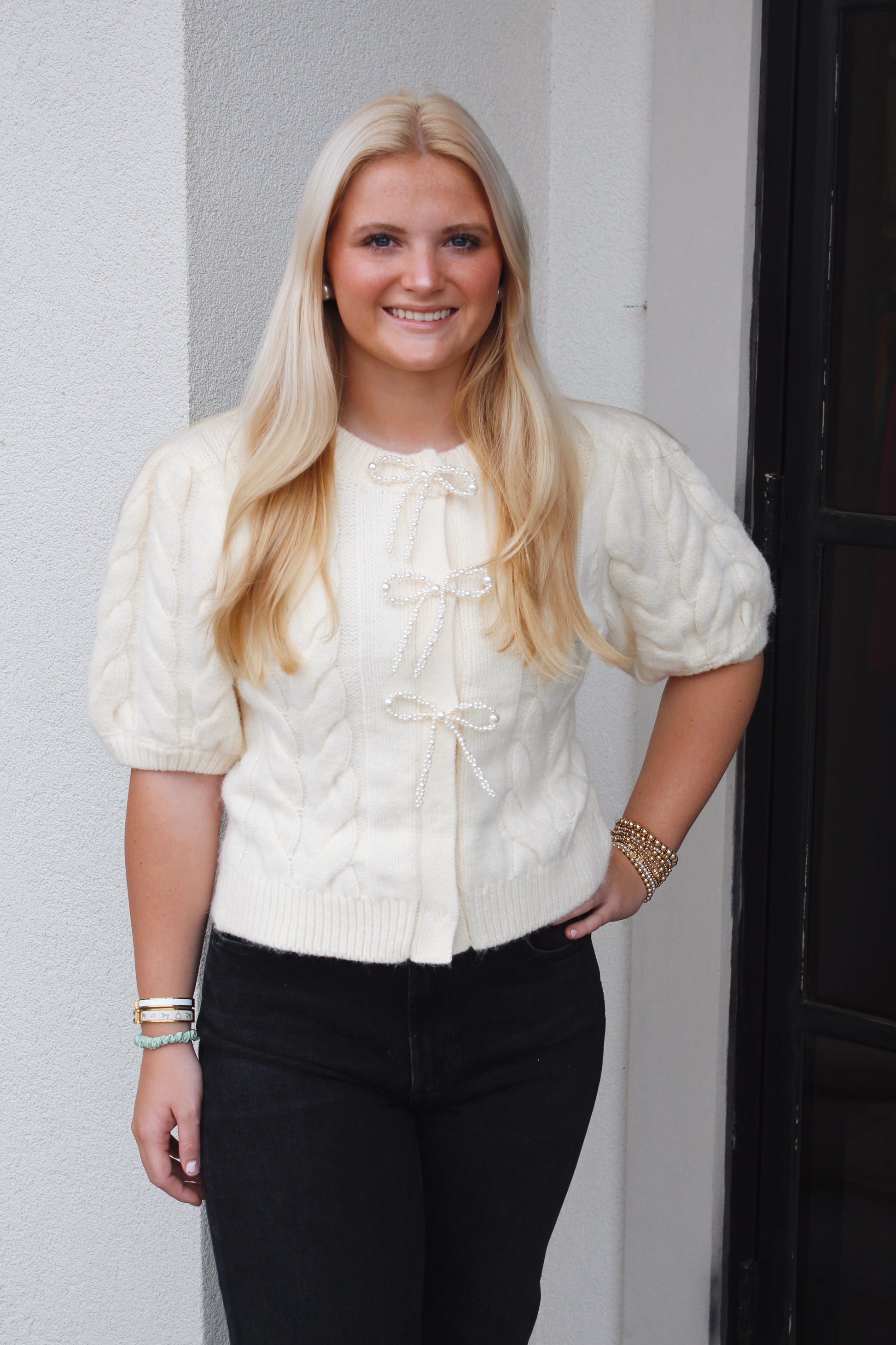 Cable Puff Sleeve Knit w/Pearl Bow - Cream